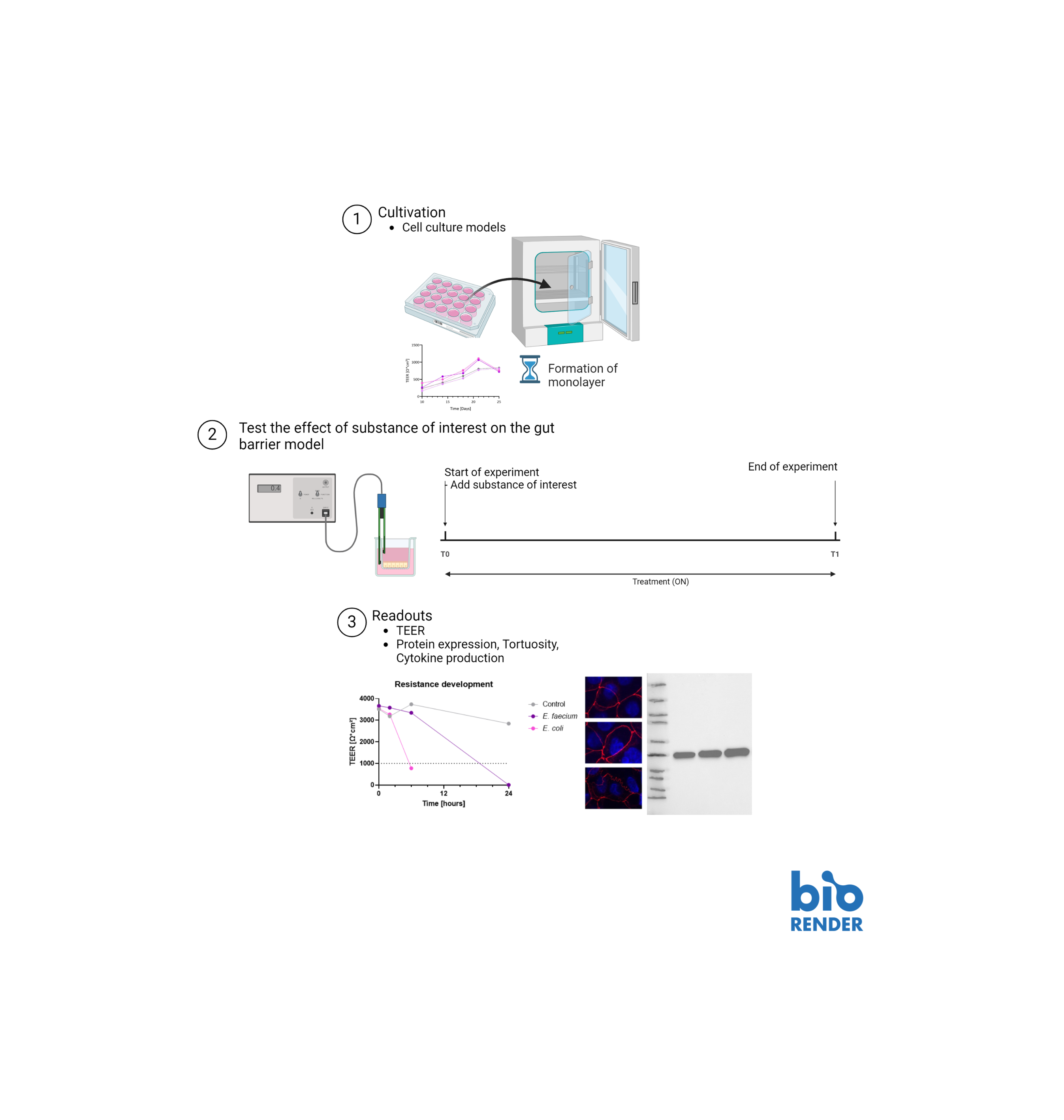 To unravel the underlying mechanisms of different effects on the gut barrier, we apply a variety of readouts from protein expression, over tortuosity and cytokine production, to visualization of tight functions.